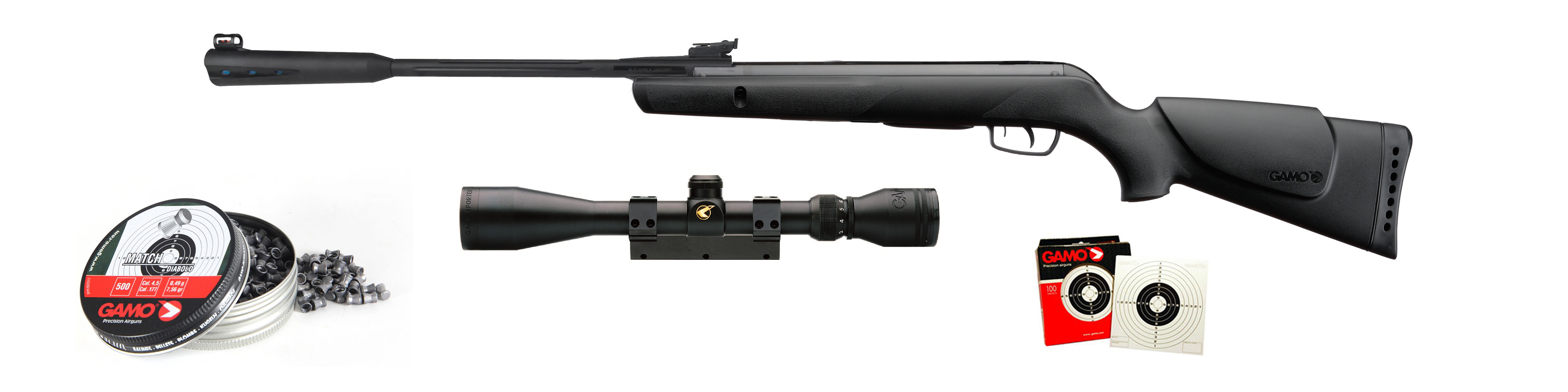 Sada obsahuje: vzduchovou pušku, puškohled GAMO 4x32 WR, diabolky GAMO Training 250 ks,